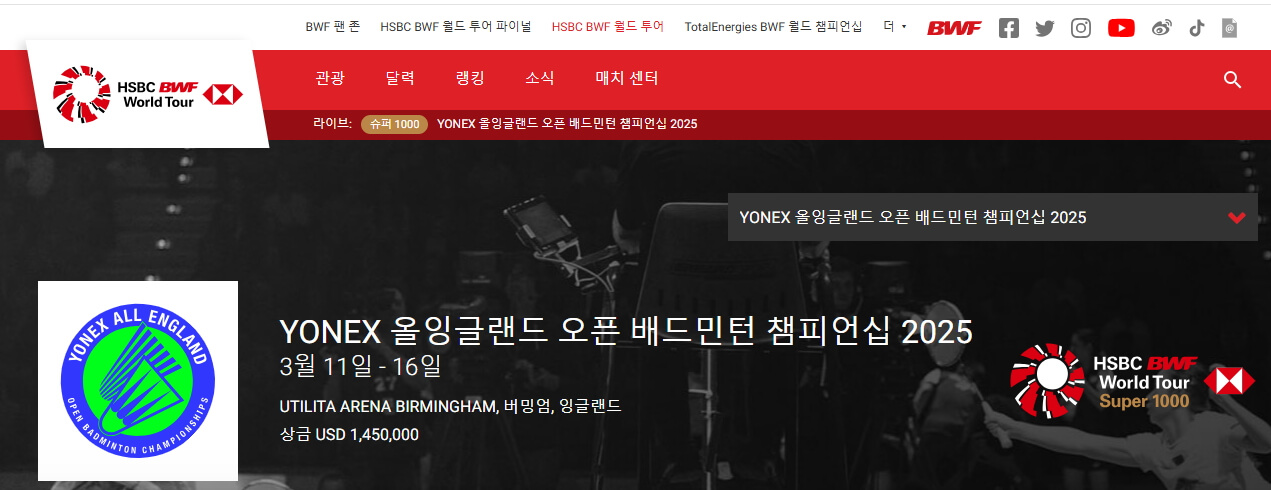 영국 버밍엄에서 매년 개최되며, 세계 정상급 선수들이 출전해 치열한 경쟁을 펼칩니다. 이 대회는 배드민턴의 ‘윔블던’이라고 불릴 정도로 오랜 역사와 전통을 자랑하며, 배드민턴 팬들에게 가장 중요한 대회 중 하나로 손꼽힙니다.